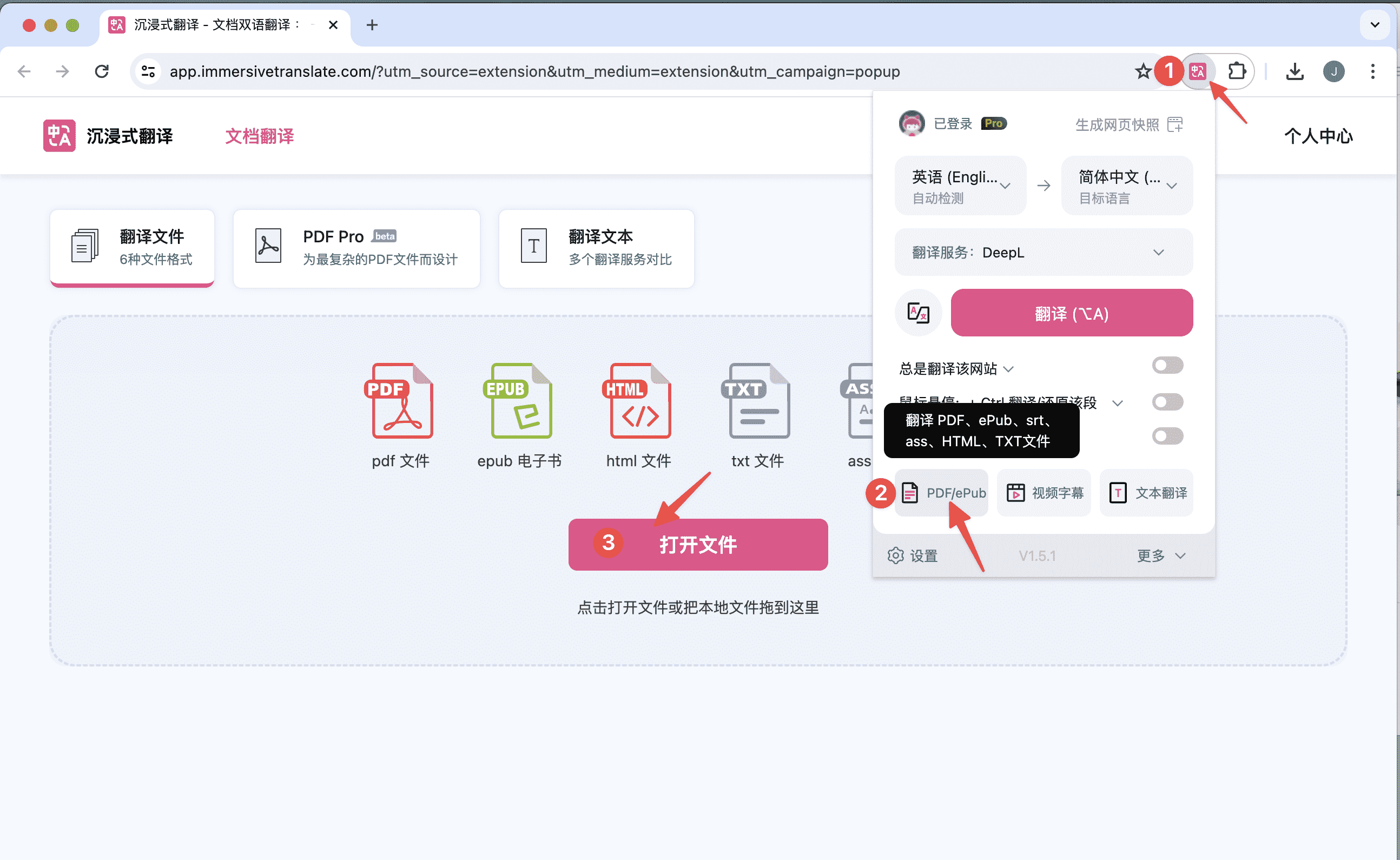 点击插件图标 —> 更多,选择“阅读电子书”(支持 Epub,Mobi 等常见格式)或者“制作双语 Epub 电子书”。